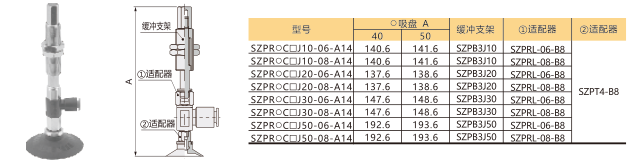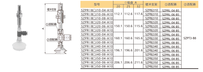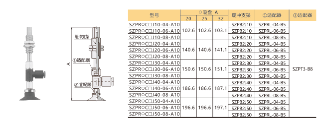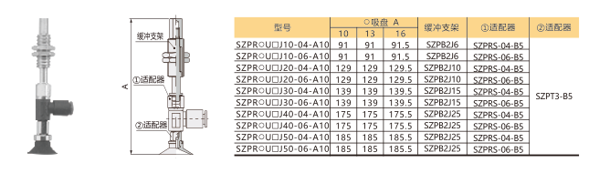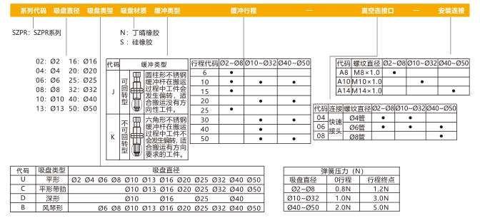 訂貨舉例:SZPT系列帶緩沖型真空吸盤,吸盤直徑?10,平行吸盤,丁晴橡膠,不可回轉型,緩沖行程20,真空連接口:外螺紋M5×0.8;安裝連接螺紋直徑M10X1.0。其訂購碼為:SZPT10UNK20-B5-A10