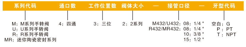 訂貨舉例:R系列手轉(zhuǎn)閥,三位四通,2系列閥體,1/4"接管口徑,G牙,