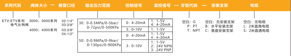 訂貨舉例:ETV系列電氣比例閥,3000系列閥體,接管口徑為1/4”,輸出壓力0-0.9MPa,控制信號0-10V,1-5V監(jiān)控信號,G牙,水平安裝支架,G牙,2米直通電纜。其ERP編碼為:ETV3000-025031-BS。