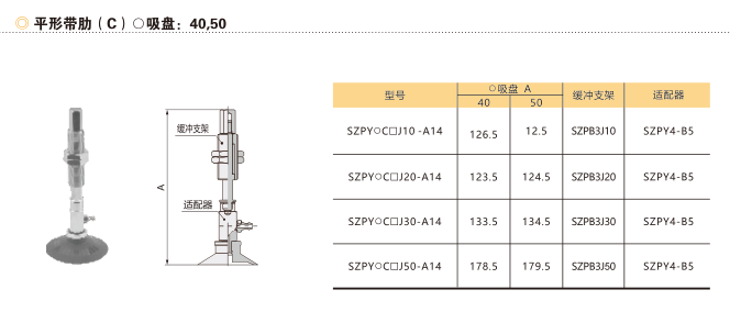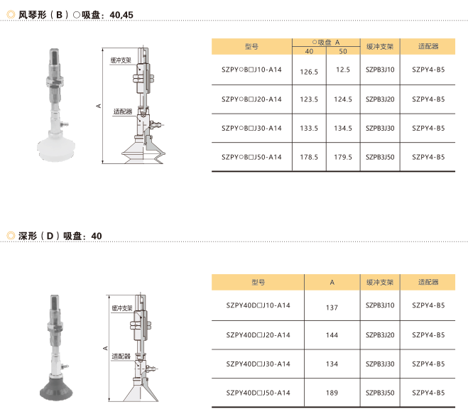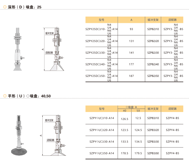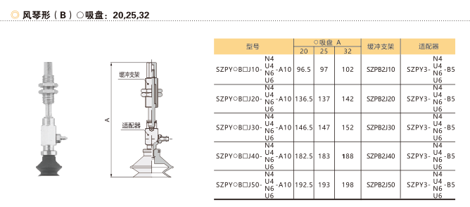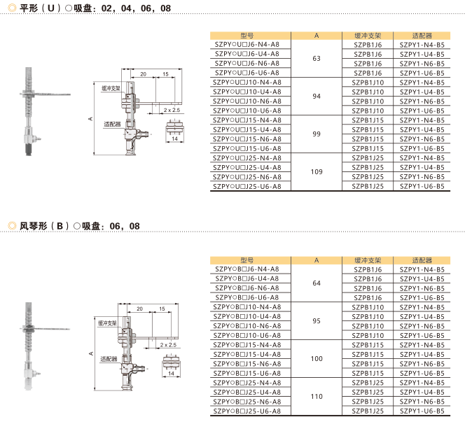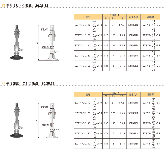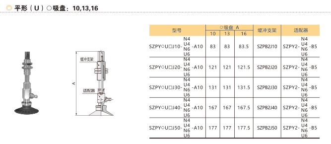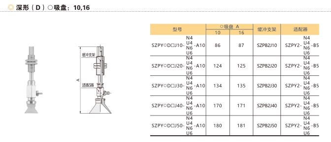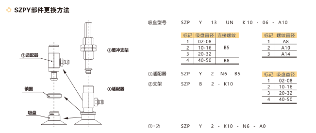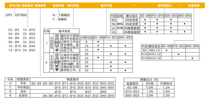 訂貨舉例: SZPY系列帶緩沖型真空吸盤,吸盤直徑010,平行吸盤,丁晴橡膠,不可回轉型,緩沖行程20,真空連接口: 倒鉤接頭006管;安裝連接螺紋直徑M10X1.0。其訂購碼為:SZPY10UNK20-06-A10