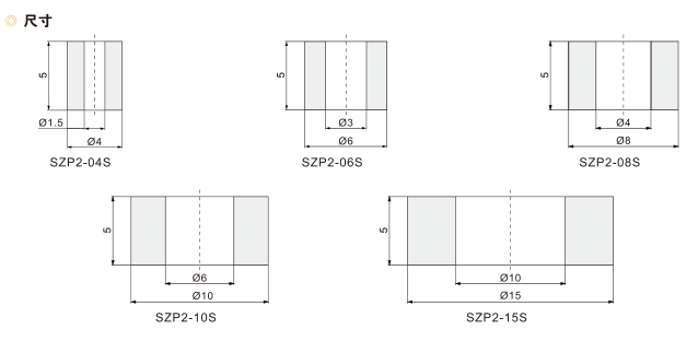訂貨舉例: SZP2系列真空吸盤,重直真空口方向,吸盤直徑06,吸盤類型:海綿,安裝螺紋尺寸M5x0.8,其訂購碼為: SZP2-T06S-A5