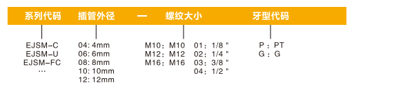 訂貨舉例:SPC系列不銹鋼接頭,配4mm插管外徑,接管口徑為PT1/8",接頭材質SS316,其ERP編碼為:SPC4-01S1