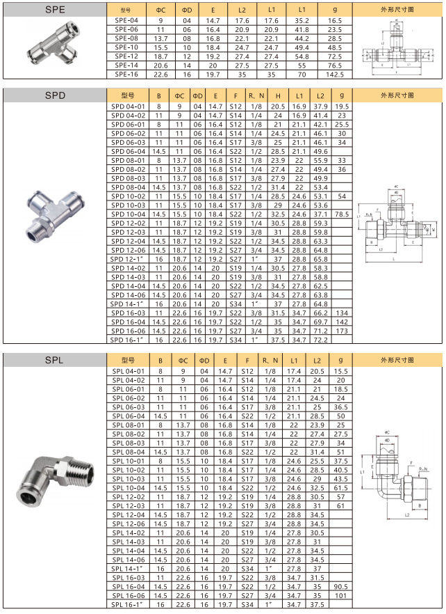 備注:如果兩端皆為插管,則管子外徑尺寸并列顯示,如尺寸相同只顯示一個;如SPU不銹鋼接頭,均配6mm外徑的管子,接頭材質SS316,其ERP編碼為:SPU06S1