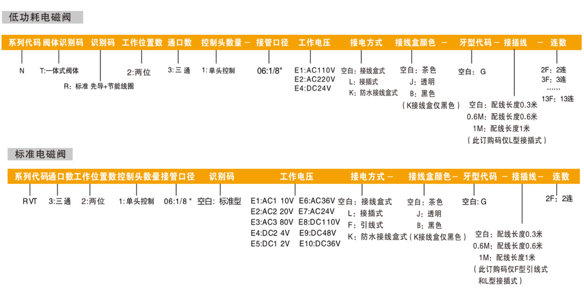 訂貨舉例:RVT系列電磁閥,二位三通,單頭控制,接管口徑為1/8,電壓為AC110V,接電方式為接線盒式,接線盒顏色為茶色,G牙,5連,其ERP編碼為:RVT321-06E1-5F