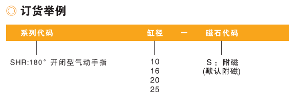 訂貨舉例:180°開閉型氣動手指,缸徑為25,附磁石,其ERP編碼為:SHR25-S