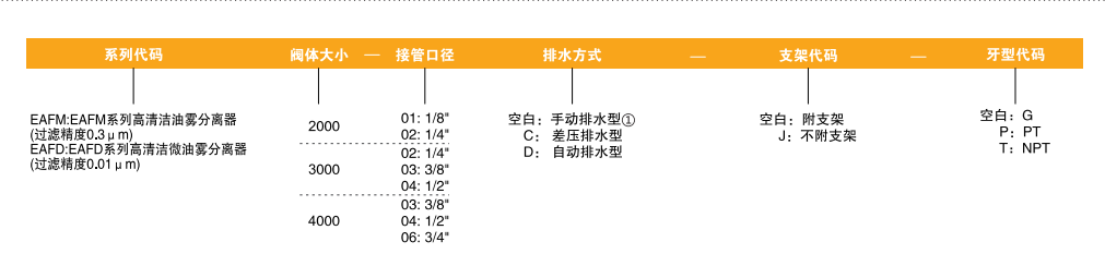 訂貨舉例:EAFM系列高清潔油霧分離器,閥體大小3000,接管口徑1/4,手動排