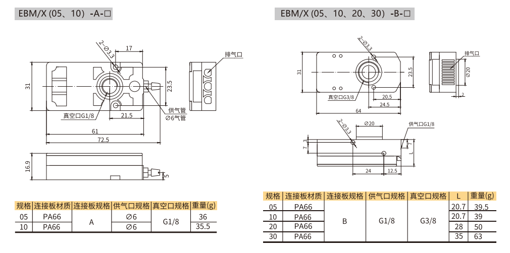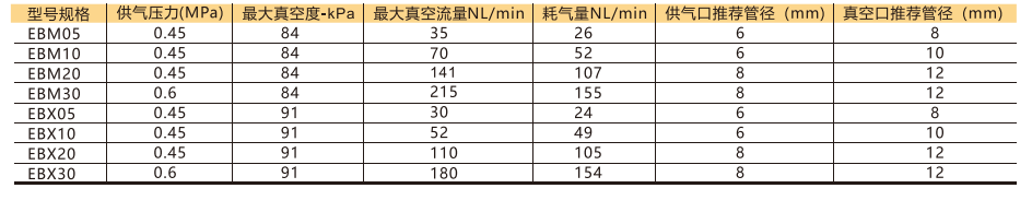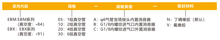 訂貨舉例:EBM系列真空發(fā)生器,1組真空管,φ6氣管寶塔接頭內(nèi)置消音器,丁晴橡膠。其訂購碼為:EBMO5-A-V