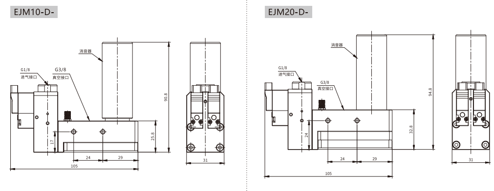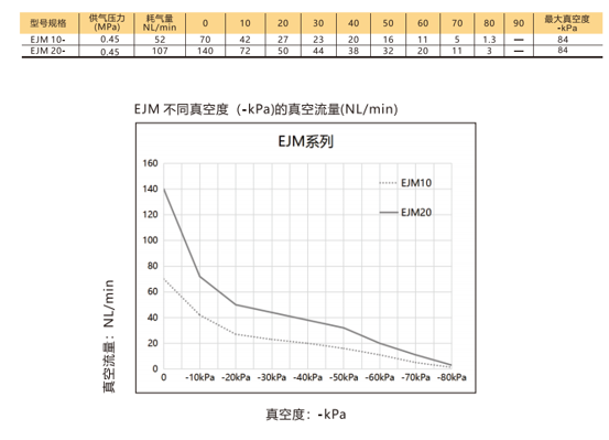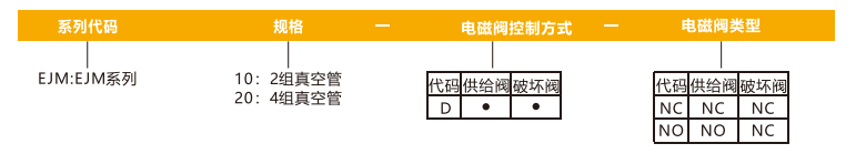 訂貨舉例:EJM系列真空發生器,1組真空管,電磁閥,控制方式:供給閥,破壞閥。其訂購碼為:EJM10-D-NC