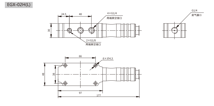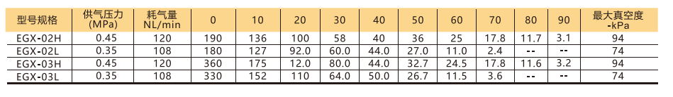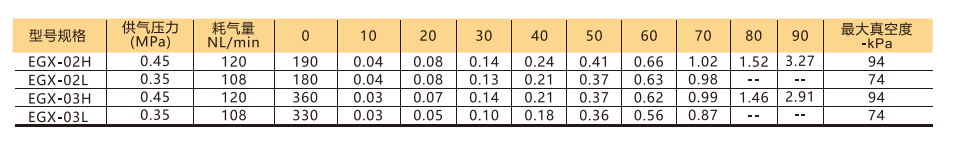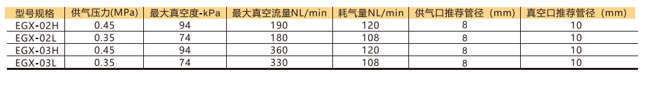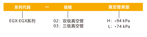 訂貨舉例:EGX系列真空發生器,雙級真空管,真空管類型: -94kPa。其訂購碼為: EGX-02H