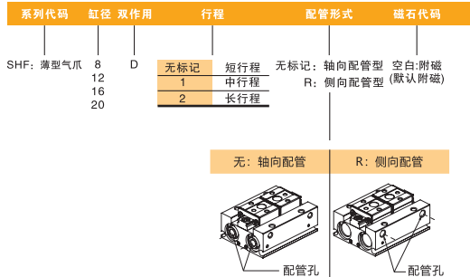 訂貨舉例:SHF薄型氣爪,缸徑為12,中行程,側面進氣,附磁,其ERP編碼為:SHF12D1R。