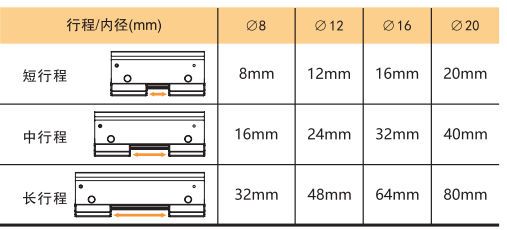注: 各缸徑的短、中、長3種行程已標準化,可選擇與工件配合最適合的行程。