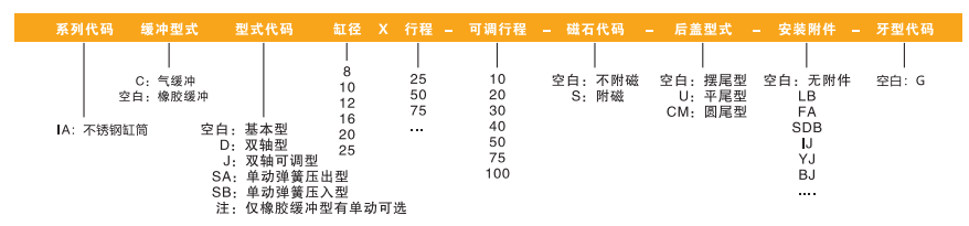 備注:1.如有氣缸有多種安裝附件,則依次按此順序編碼:LB/FA/SDB/IJ/YJ/BJ