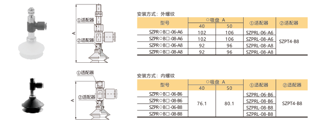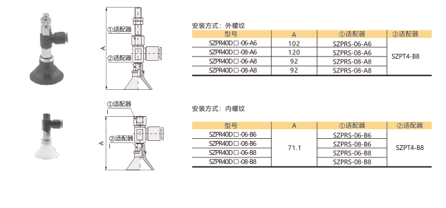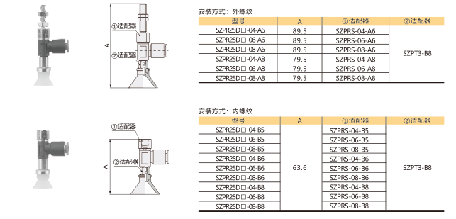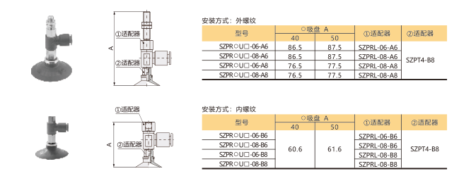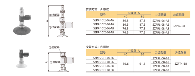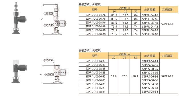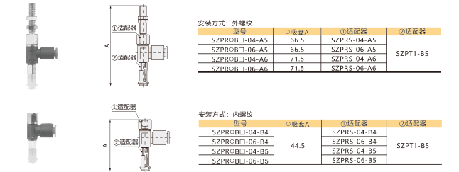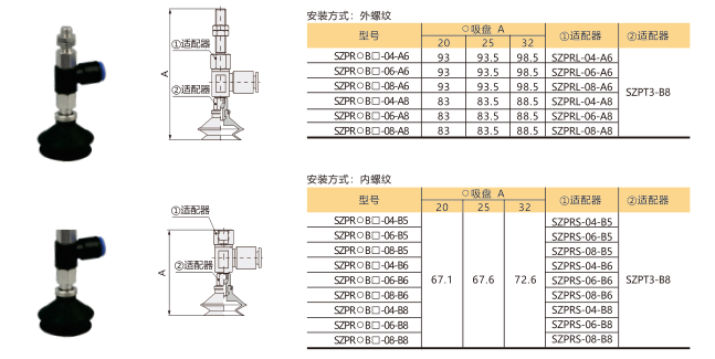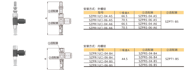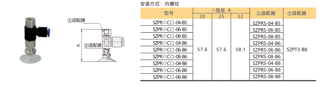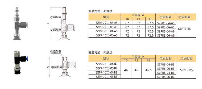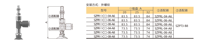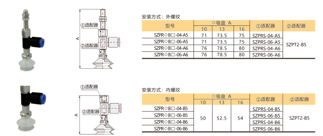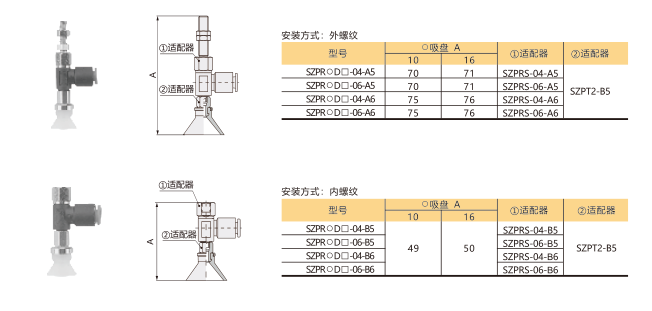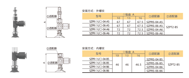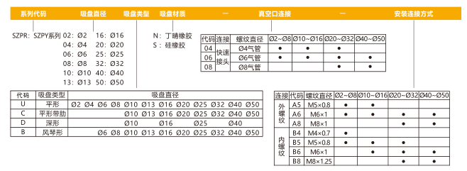訂貨舉例:SZPR系列不帶緩沖型真空吸盤,吸盤直徑?10,平行吸盤,丁晴橡膠,真空連接口:快速接頭?04氣管;安裝連接方式:外螺紋,螺紋直徑M5×0.8。其訂購碼為:SZPR10UN-04-A5