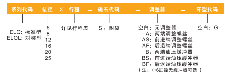 訂貨舉例:ELQ系列標準型氣缸,缸徑為20,行程為50,附磁石,無調整器,本體牙型為G牙,其ERP編碼為:ELQ20X50-S