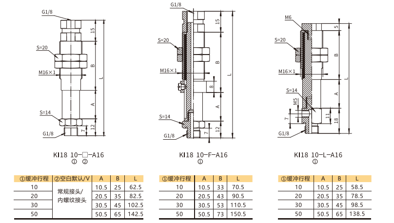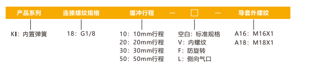 訂貨舉例:KI系列緩沖支桿,連接螺紋規格G1/8,緩沖行程10mm,標準規格,導套外螺紋M16×1其訂購碼為:KI1810-□-A16