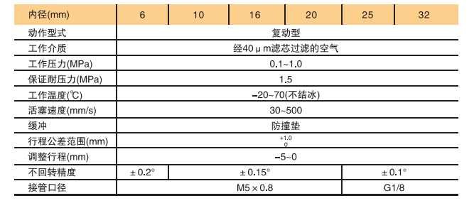 | 內徑(mm) | 標準行程(mm) | 最大行程(mm) |