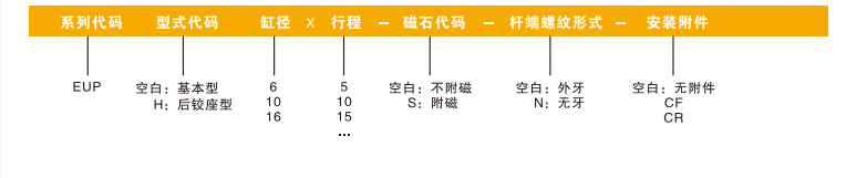訂貨舉例:EUP系列基本型氣缸,缸徑10,行程50,附磁石,無(wú)安裝附件,其ERP編碼為:EUP10X50-S