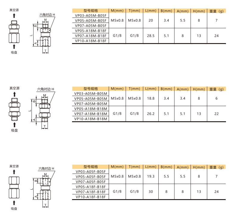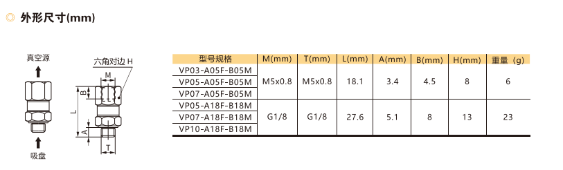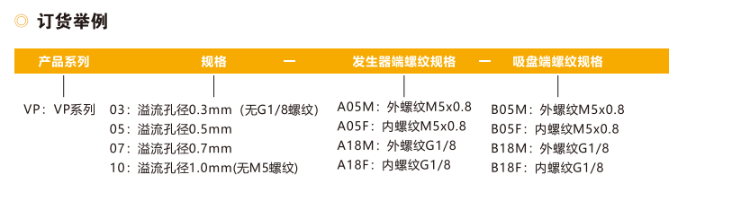 | 訂貨舉例:VP系列單向閥,溢流孔徑0.3mm(無G1/8螺紋),發(fā)生器端外螺紋M5x0.8,吸盤端內(nèi)螺紋M5x0.8。其訂購碼為:VP03-A05M-B05F 注:產(chǎn)品的兩端螺紋只能選擇同規(guī)格,但不限制內(nèi)外螺紋方式。例如:VP05-A18M-B18F |