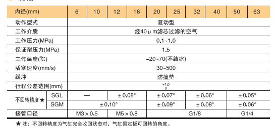 注:中間非標(biāo)行程制作,是采用加墊板于標(biāo)準(zhǔn)行程氣缸內(nèi);φ12~φ32缸徑對應(yīng)每1mm行程φ40 ~φ63缸徑對應(yīng)每5mm行程;例如訂購SGL20*47非標(biāo)行程缸,則是由SGL20*50標(biāo)準(zhǔn)行程缸內(nèi)加3mm墊片改制而成,其外形尺寸、安裝尺寸與SGL20*50相同。