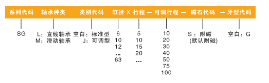 訂貨舉例:SG系列氣缸,軸承種類為直線軸承,缸徑16,行程30,其ERP編碼為:SGL16X30-S